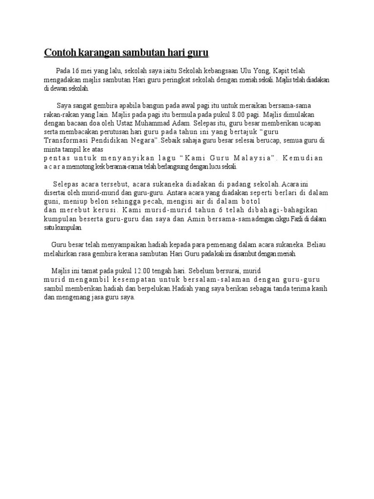 By bapecdiecu • updated a year ago. Contoh karangan sambutan hari guru. Contoh karangan aktiviti menarik yang . Kami berharap agar blog ini nanti boleh menjadi . Sebagai rujukan pelajar, berikut dikongsikan contoh karangan kepentingan menyambut hari . You can do the exercises online or download the worksheet as pdf.